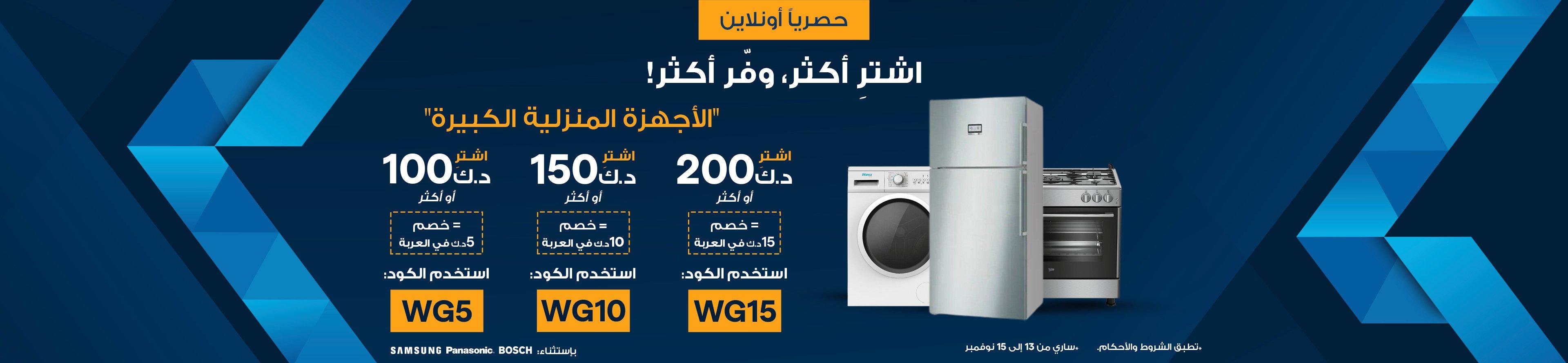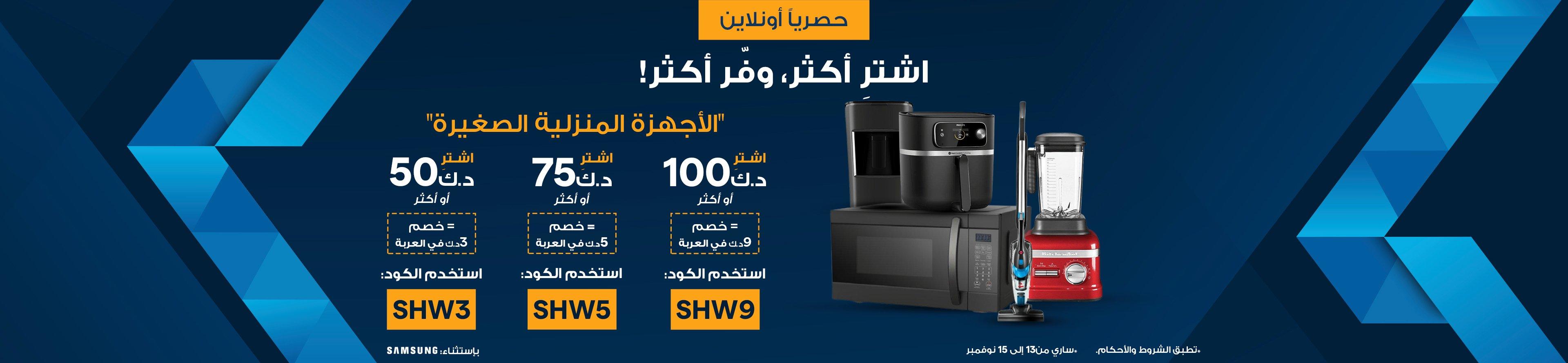 قيمة المنتج الخصم كود الخصم اشتري 50 د.ك خصم 3 د.ك SHW3 اشتري بقيمة 75 د.ك خصم 5 د.ك SHW5 اشتري بقيمة 100 د.ك خصم 9 د.ك SHW9 - 5. الأكواد الخاصة بمنتجات الأجهزة المنزلية الكبيرة.